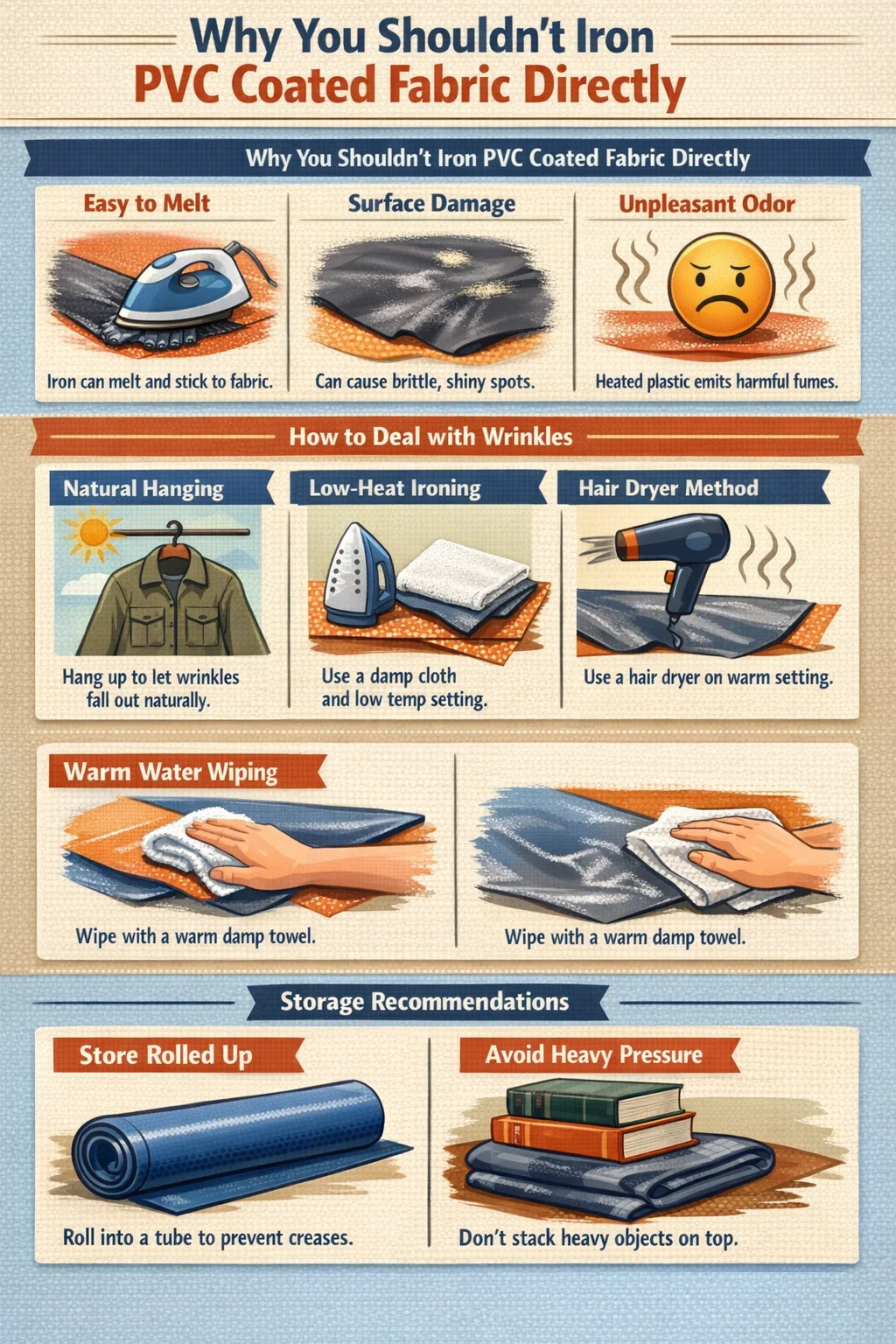 Low-temperature ironing with a cloth barrier: If you absolutely must use an iron, set it to the lowest temperature. Place a thick, damp cotton cloth on the back of the PVC coated fabric (the side without the coating) as a buffer. Never let the iron directly touch the fabric, and keep the iron moving constantly; never leave it in one place.