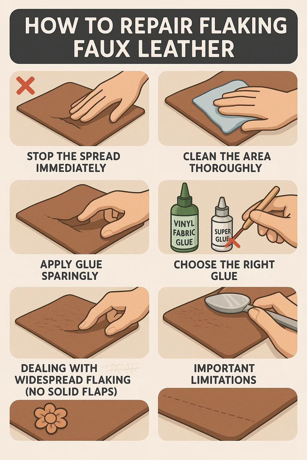 Here's a practical guide for dealing with flaking faux leather or PVC coated fabric, based on common fixes: