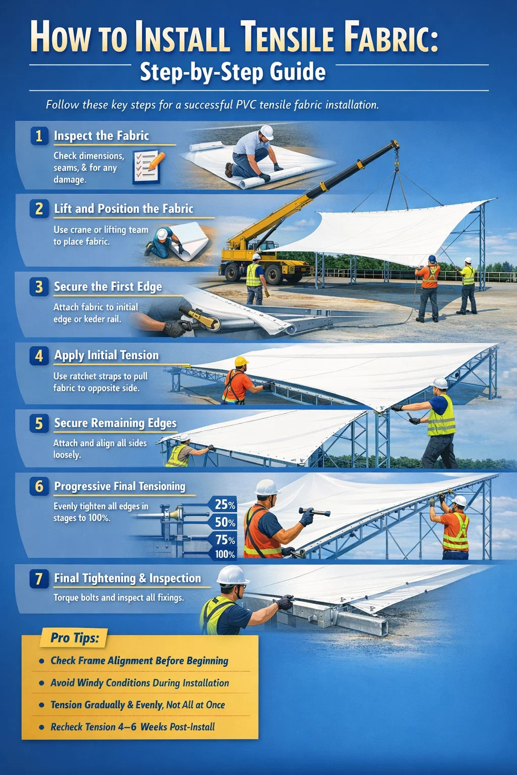 The following sequence applies to most commercial and architectural PVC tensile fabric installations. Adjust based on the specific edge attachment system used — keder rail, plate clamp, or rope-in-channel.