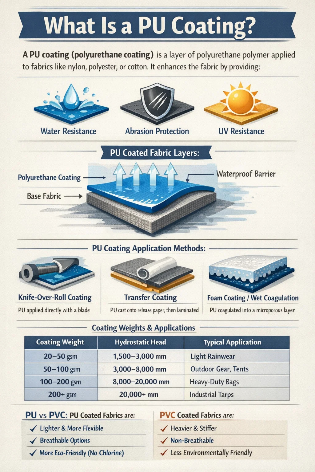- Choose PU coating for garments, wearable accessories, lightweight outdoor equipment, breathable waterproofs, healthcare upholstery, marine upholstery, cold-climate applications, and any product where light weight, soft hand, or breathability is a differentiating requirement. PU is also the correct choice where environmental certification (bluesign, OEKO-TEX, REACH compliance) is essential to market access.